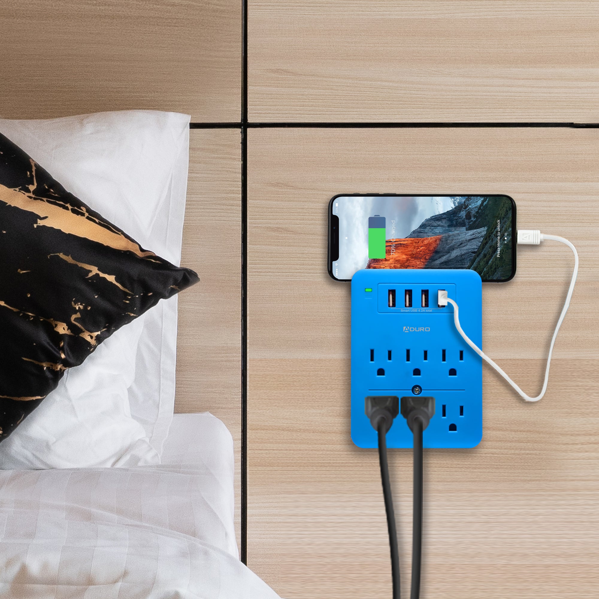 The Aduro Surge Multi Charging Station with 6 Outlets & 4 USB Ports charges 10 power-hungry devices at once, without looking for available outlets so its much more convenient for you and your family to charge simultaneously. Its small & compact size is perfect for travel and taking it with you whenever you're on the go, and its Safety Shutdown Technology & Smart Charge USB ports ensure protection & power charge efficiency. It also has a phone stand where you can conveniently place your phone while it charges.