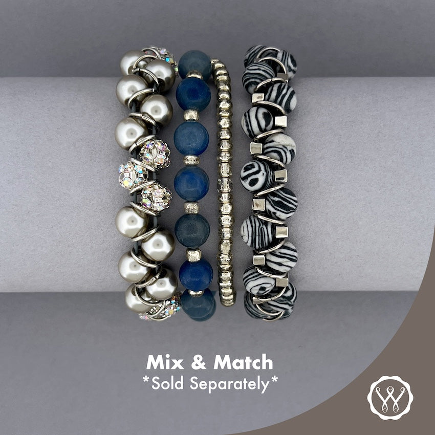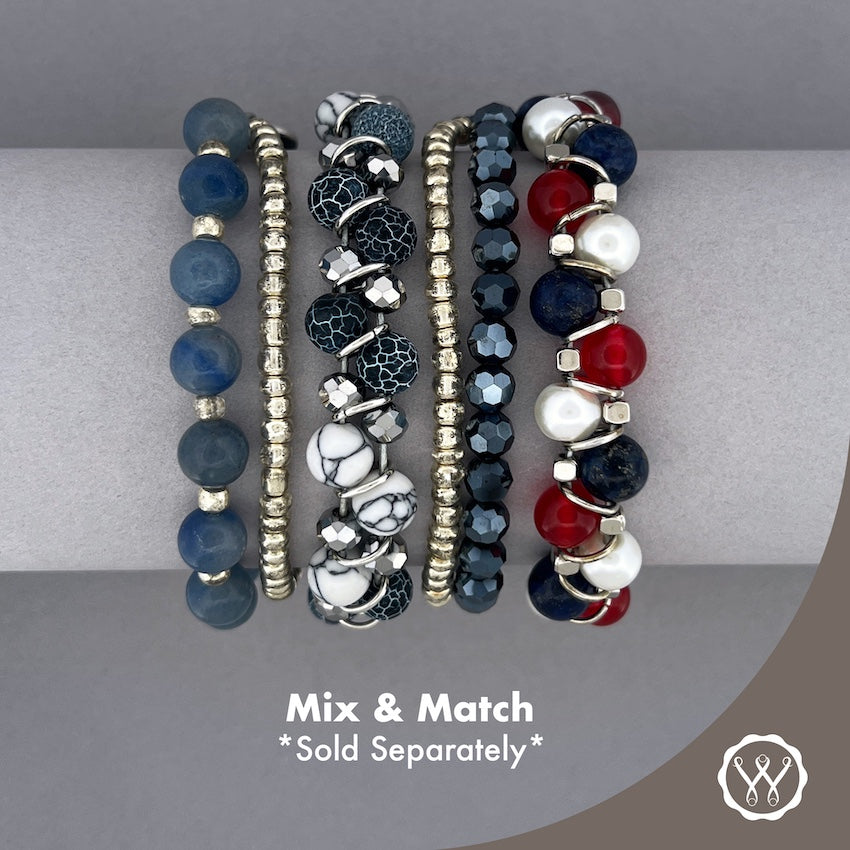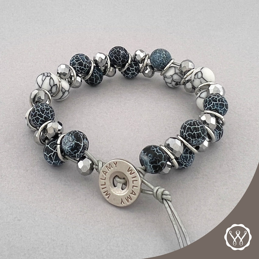 DENIM SHIMMER:A delightful combination of our popular Blue Crackled Agate, White Howlite and silver crystals on metallic gray leather.