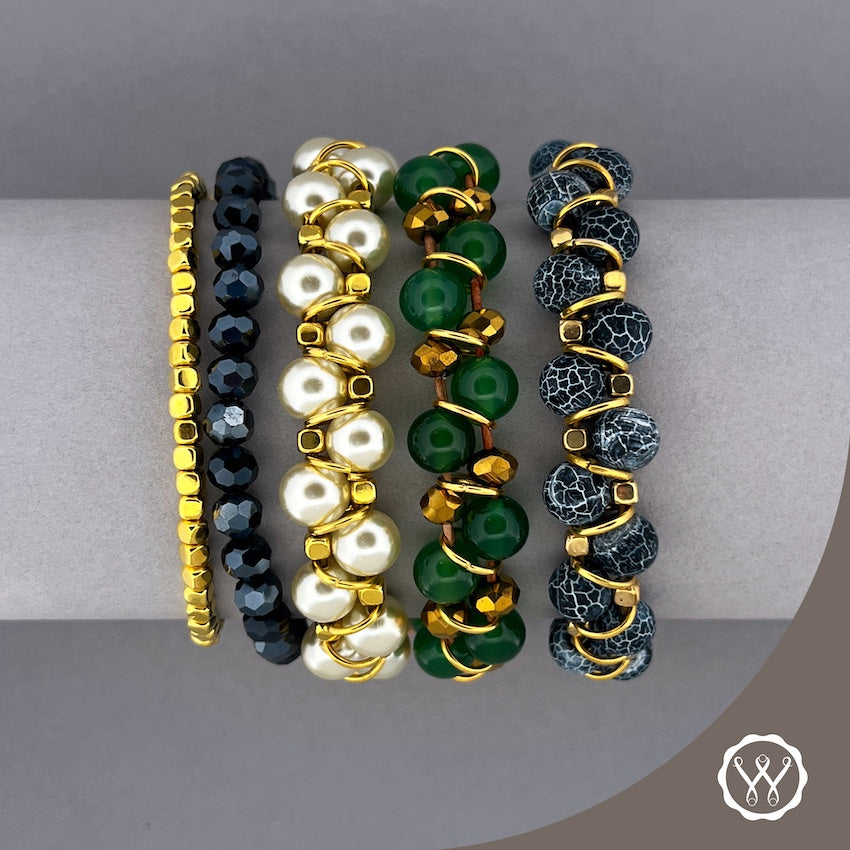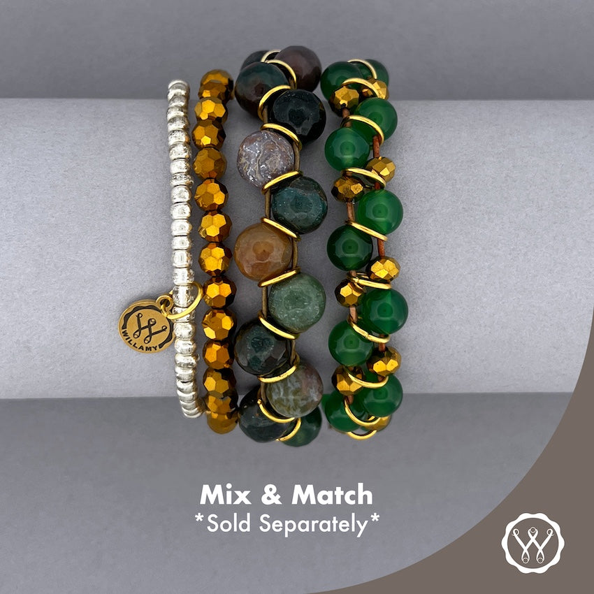 A luxurious statement piece that radiates elegance and sophistication, our Emerald Radiance bracelet is handcrafted with emerald green Agate stones and gold crystals on natural leather. Fastens with an engraved Willamy metal button, Includes XS-S-M-L Sizing Options