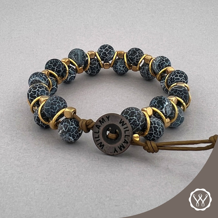 GOLD DEMIM: Our Gold Denim Windsor is a sleek and modern single wrap bracelet features stunning 8mm Blue Crackled Agate and gold-tone side beads on dark brown leather.