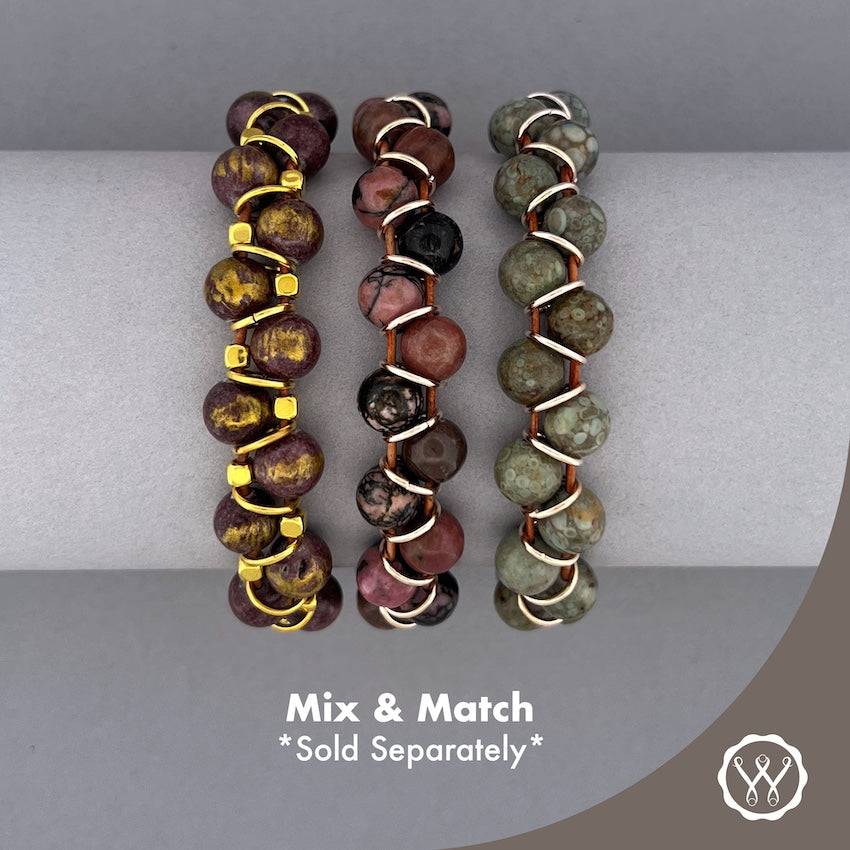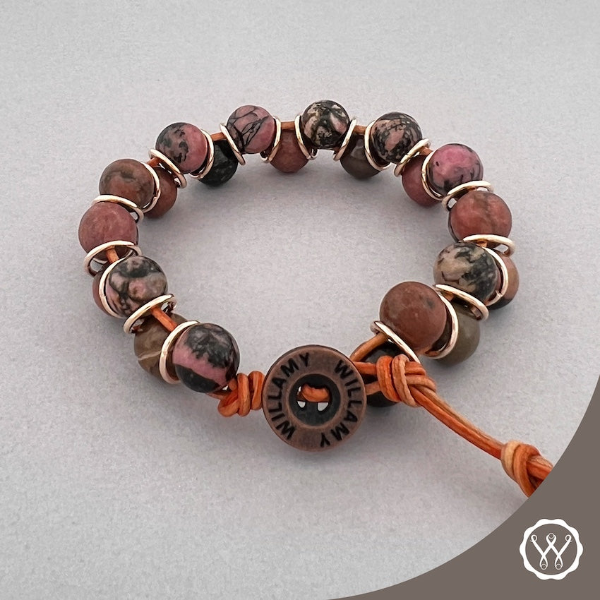 KHAKI ROSE: An earthy and natural look, our Khaki Rose bracelet features black line pink Agate with rose-gold tone jump rings on natural leather.
