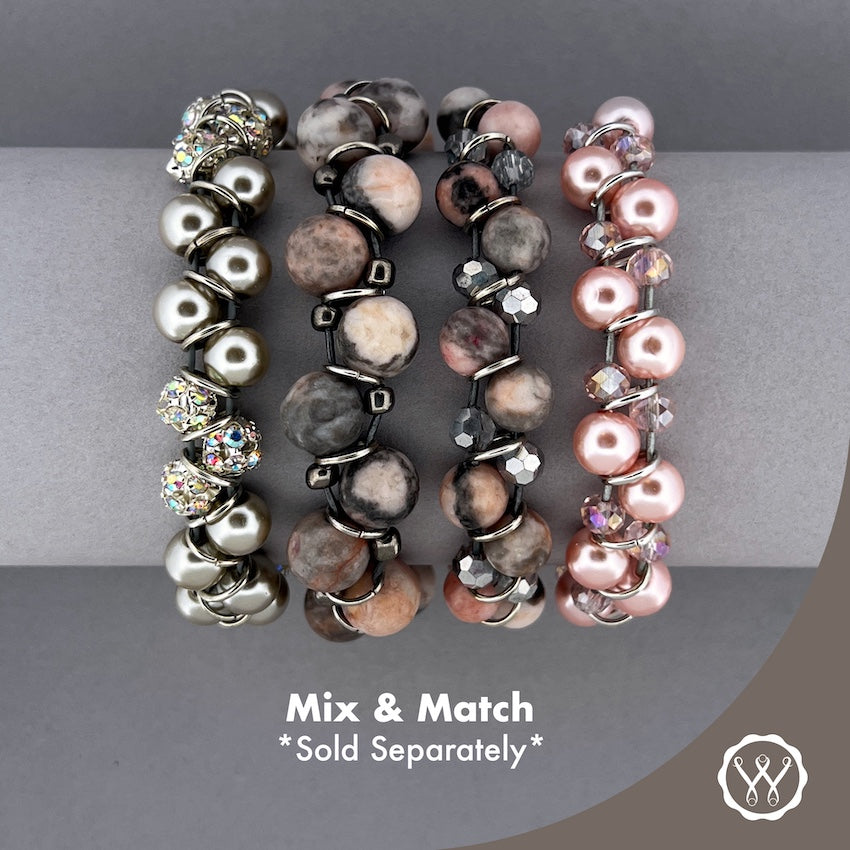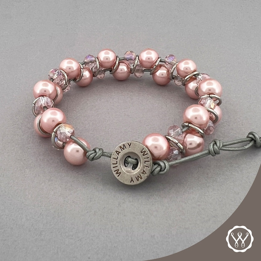 PINK CRYSTAL PEARL: A true shine-fest with pink accent crystals to reflect the lovely blush Czech glass pearls, handcrafted on natural, genuine leather.