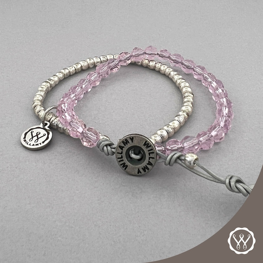 PINK & SILVER ARTISAN: handcrafted with Pink Crystals on metallic silver leather with silver-tone Miyuki glass seed beads.