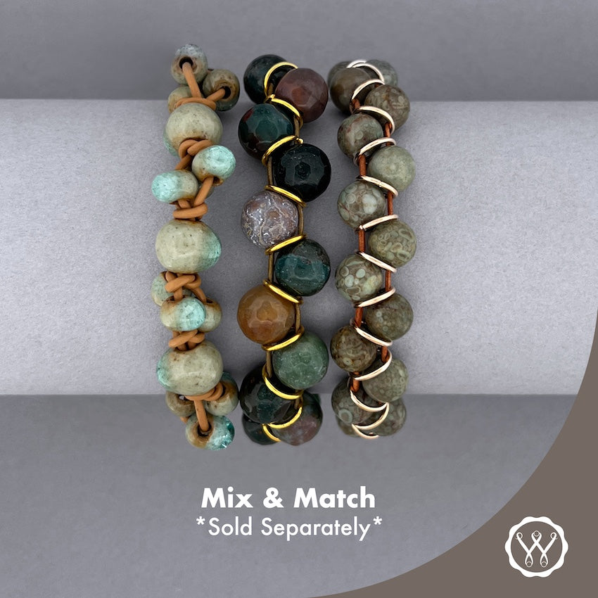 Our Riverbend stackable bracelet features stunning & colorful 10mm India Agate stones accented with gold tone seed beads on metallic leather. Fastens with an engraved Willamy metal button.