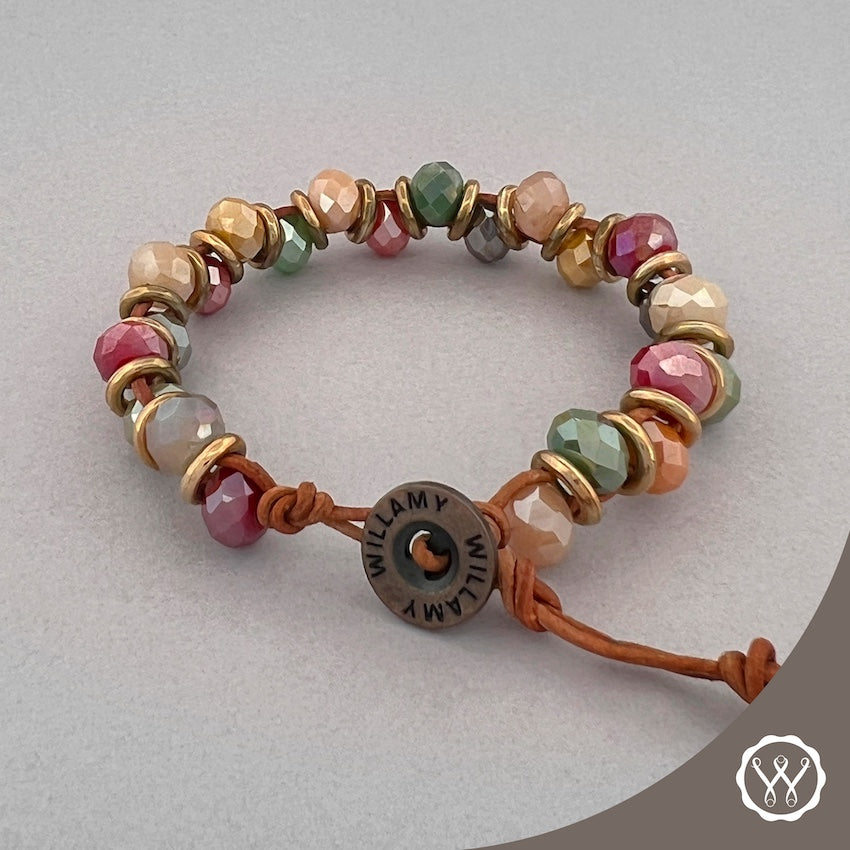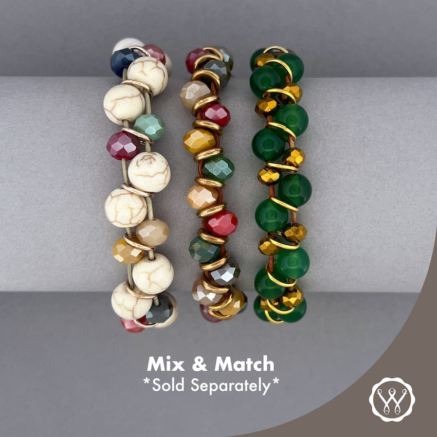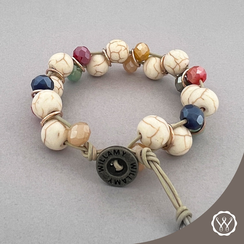 ROXANNE: Our new Roxanne bracelet is a captivating mix of Ivory Howlite and multi-colored crystals on natural leather sure to add a touch of sophistication to your everyday look.