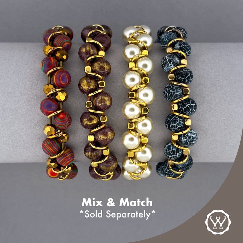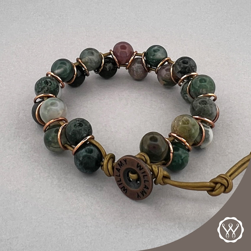RIVERBEND PETITE: Stunning & colorful 8mm India Agate stones accented with gold tone seed beads on metallic leather.*Petite refers to the stone size, not bracelet size