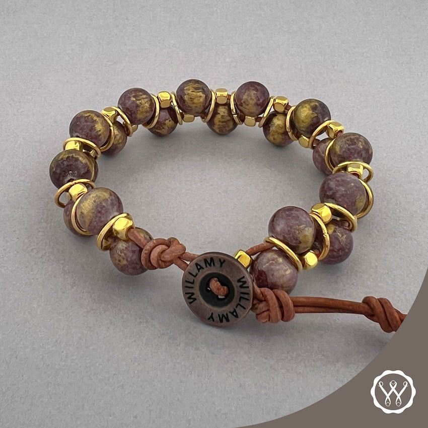 ROYAL SHIMMER JADE: Featuring gold shimmer, deep purple Jade stones, surrounded by gold-tone accent beads. Handcrafted on natural, genuine leather and fastens with an engraved Willamy metal button.