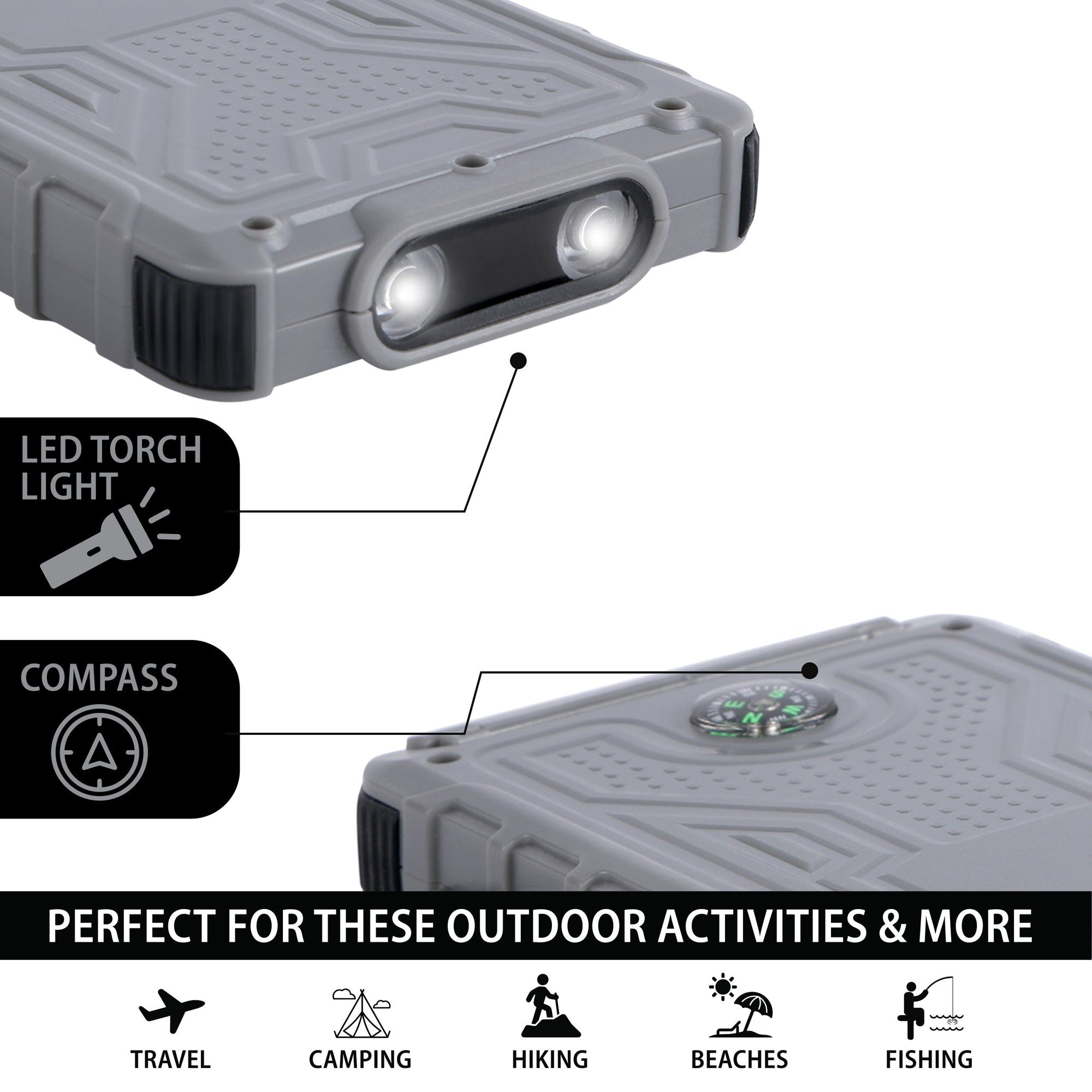 Powerful built in twin flashlights and integrated compass make this the perfect device for all your outdoor activities, and the sleek slim size makes it the perfect fit for your pocket, backpack, or purse